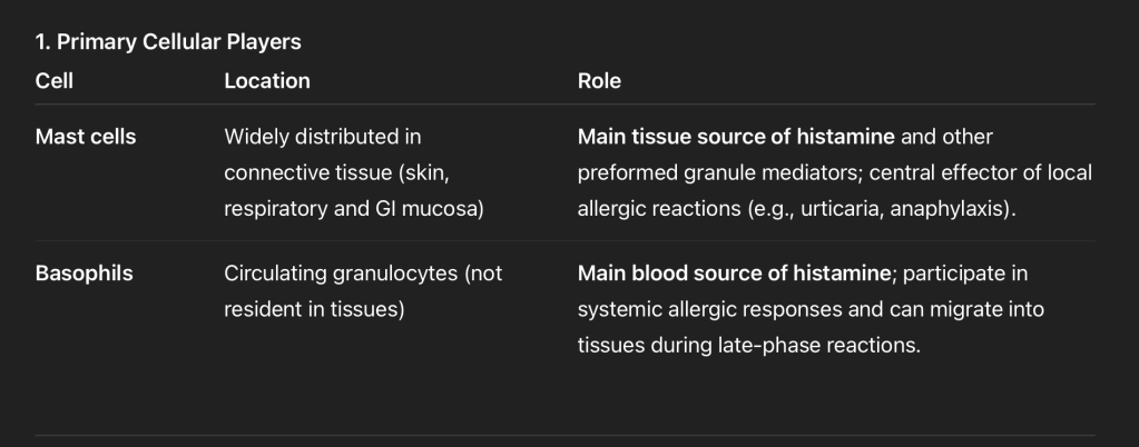 • Type I hypersensitivity hinges on IgE-primed mast cells and basophils as the principal histamine sources: