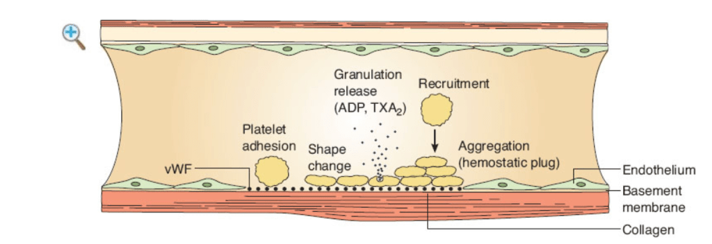 - vWF anchored on exposed collagen binds GP Ib-IX-V on platelets (high-shear arterial beds):