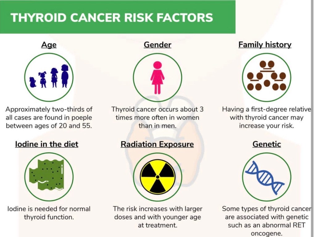 Radiation exposure to the head and neck, especially during childhood or adolescence Prior therapeutic radiation for benign or malignant conditions Family history of thyroid cancer (especially first-degree relatives)