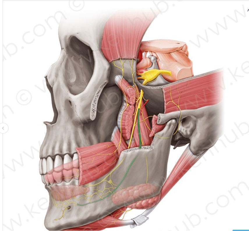 - Runs inferiorly and anteriorly towards the inferior alveolar nerve: