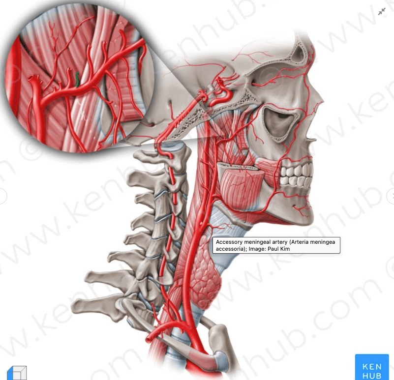 - It passes upwards through the foramen ovale to supply the dura mater of the floor of the middle fossa and of the trigeminal cave (Meckel’s cave)