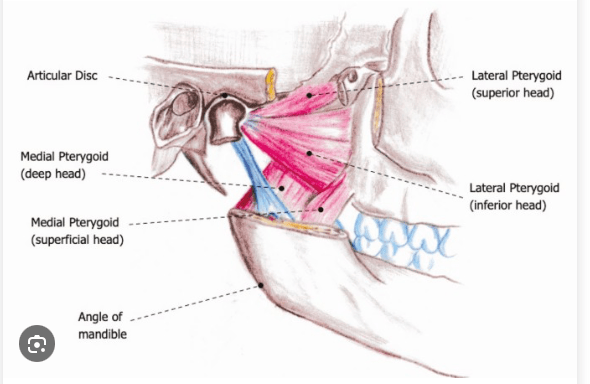 - It continues its path by running deeply to the lower head and passes forward between the two heads of the lateral pterygoid muscle: