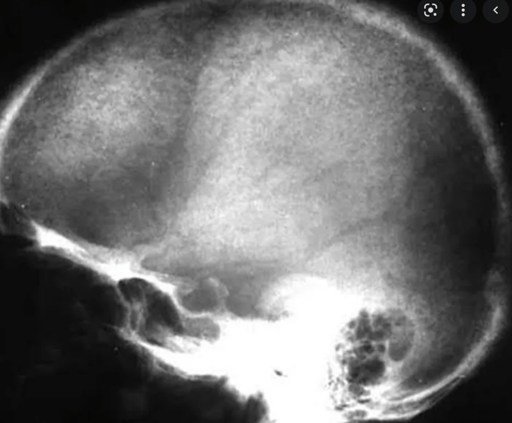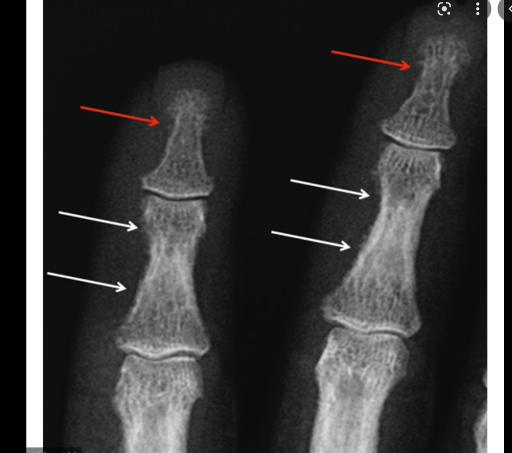 Generalized osteopenia, erosion of the terminal phalangeal tufts and subperiosteal resorption of bone particularly the radial aspects of the 2nd and 3rd middle phalanges.Brown TumorsSalt and Pepper Skull