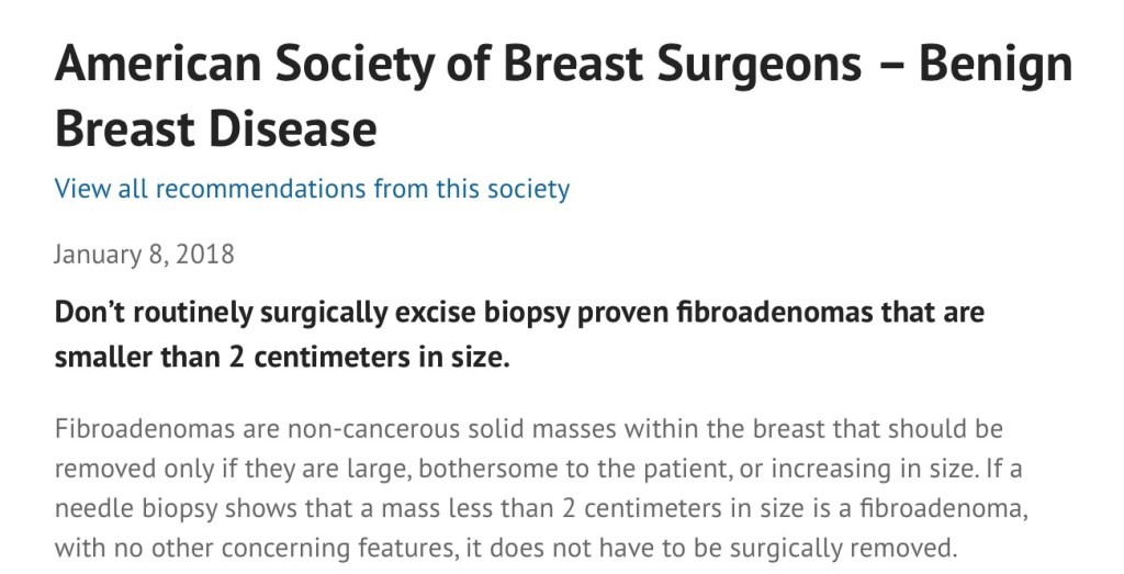 • If a needle biopsy shows that a mass less than 2 centimeters in size is a fibroadenoma, with no other concerning features: